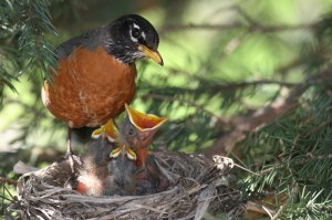 Lately, part of my morning routine has been to watch a robin feed her newly-hatched chicks in the nest just outside my window. I am always amazed at how more than one bird can grow and flourish in that small nest, hidden in the branches of a cedar. I watch as the robin delivers worms and gooey things to those open-mouthed babies, and it makes me smile as these signs of nurturing unfold. Quietly hidden or with bells and whistles, this is the season of new growth, transformation, and light – nourishing bodies, minds, and hearts. Come celebrate spring with me on your yoga mat as we stretch and breathe and OM together…